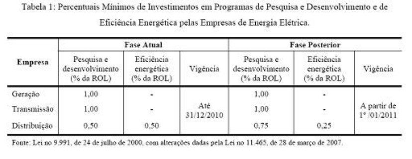 Conforme dispõe o art. 12 da Lei no 10.848, de 15 de março de 2004, os investimentos em pesquisa e desenvolvimento descritos na Tabela 1 devem ser realizados do seguinte modo: